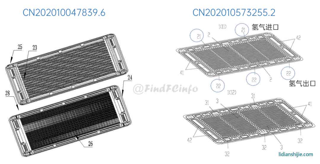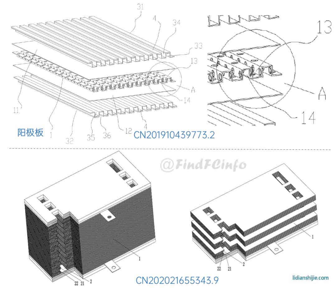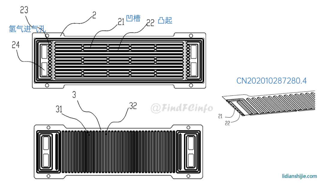 在电堆结构方面,格力的改进主要集中在提高电堆功率密度、热交换性能以及改善气体分布不均衡等。例如,专利CN201910439773.2公开了一种紧凑型燃料电池结构,两个并联的子电池共用一个阳极板,其中第一阳极气体槽道13、第二阳极气体槽道14的阳极气体可以互通,利用阳极板双侧的供气可同时满足两个膜电极的气体消耗;专利CN202021655343.9通过第一内壁部21的结构增大气体流通通道2的流通面积,使气体的分配更加均匀,提高电堆的工作效率。