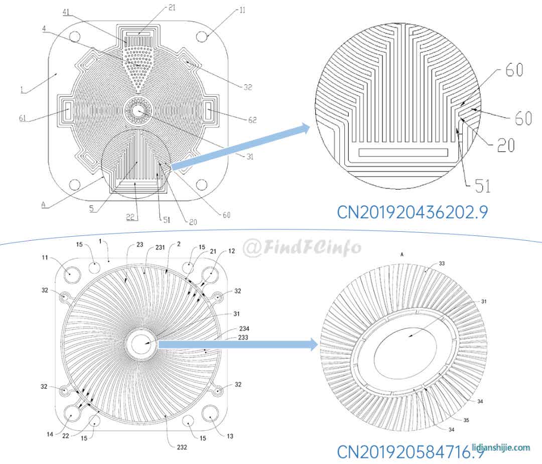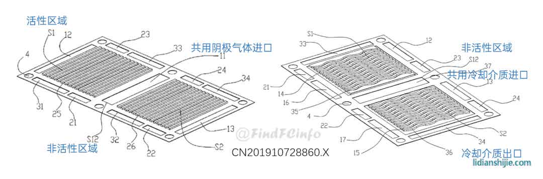 格力双极板的主要类型为金属双极板,大部分双极板用于水冷型电堆,少数双极板用于风冷型电堆。在格力早期申请的双极板专利中,有采用将冷却水入口设置在极板中心位置处的设计,以更好地对极板中央反应区域进行冷却,具体极板结构可参见下图。