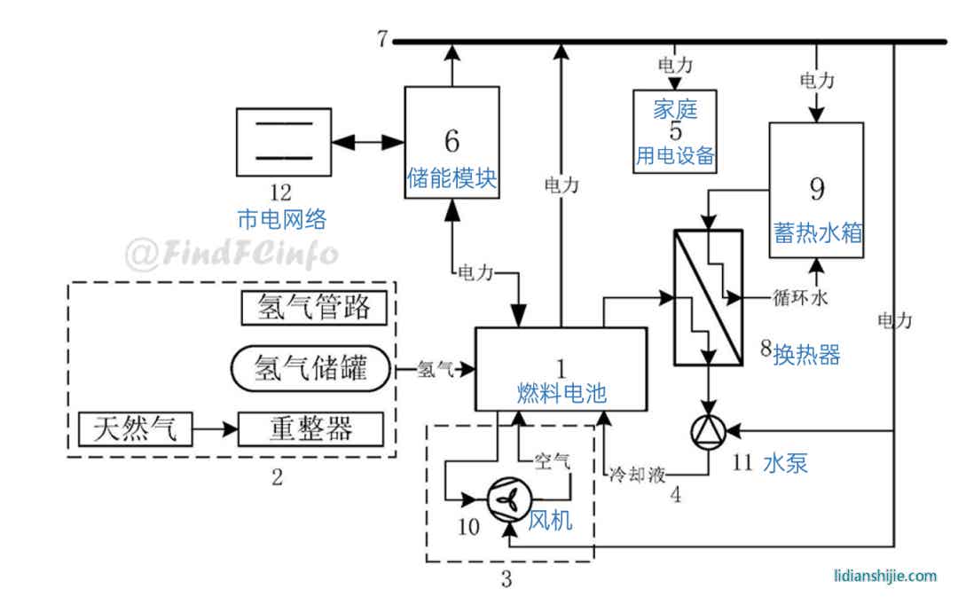 专利CN202020515628.6公开了一种家用热电联供系统,其中蓄热模块能够回收燃料电池的废热,并将热能提供给家庭使用;储能模块能够接收并存储燃料电池的电能;直流供电模块能够将燃料电池和储能模块提供的电能输送给家庭用电设备。