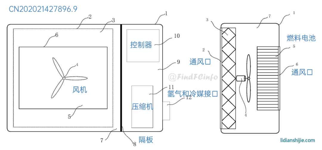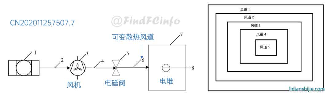 在燃料电池热管理方面,格力公开的专利既涉及风冷型电堆,也涉及到水冷型电堆。在风冷型电堆热管理上,专利CN202011257507.7通过在电堆和风机之间设置可变散热风道,利用控制器调整可变散热风道上多个散热子风道的开启数量或关闭数量,来实现对电堆的精准控温。