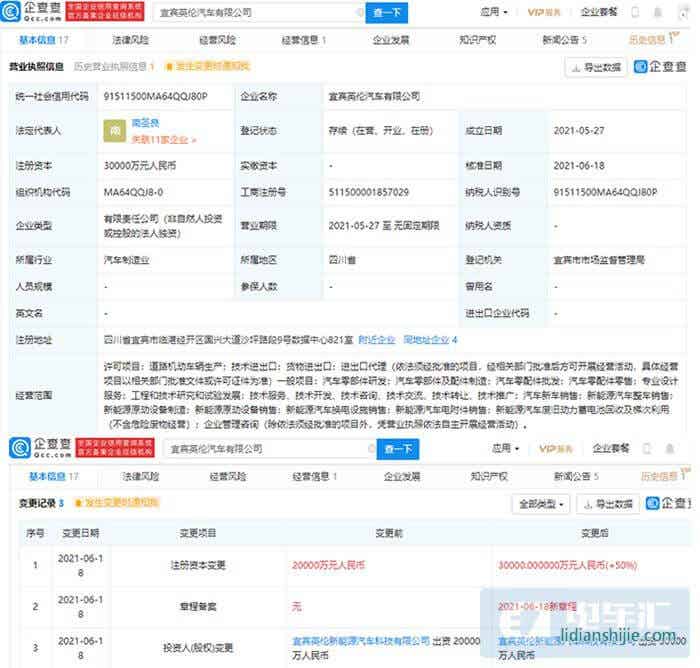 企查查信息显示,宜宾英伦汽车有限公司近日发生工商变更,公司注册资本由2亿元人民币增至3亿元人民币,增幅50%。企查查公布的信息显示,5月25日,宜宾英伦新能源汽车科技有限公司成立,法定代表人为南圣良,注册资本4亿元人民币,经营范围包含:汽车零部件研发、汽车零部件及配件制造、汽车零配件批发、汽车零配件零售、专业设计服务等。