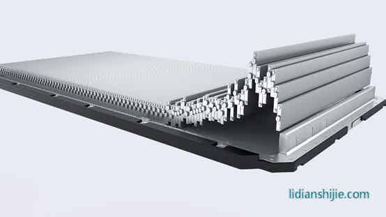 比亚迪刀片电池自身的强度来实现自我支撑,同时再依靠集成后的电芯强度来增加整个电池包的结构强度,100个刀片电池组成的电池排布在一起,并且上下两面各加一块高强度蜂窝铝板,组成类蜂窝铝三明治稳定结构。