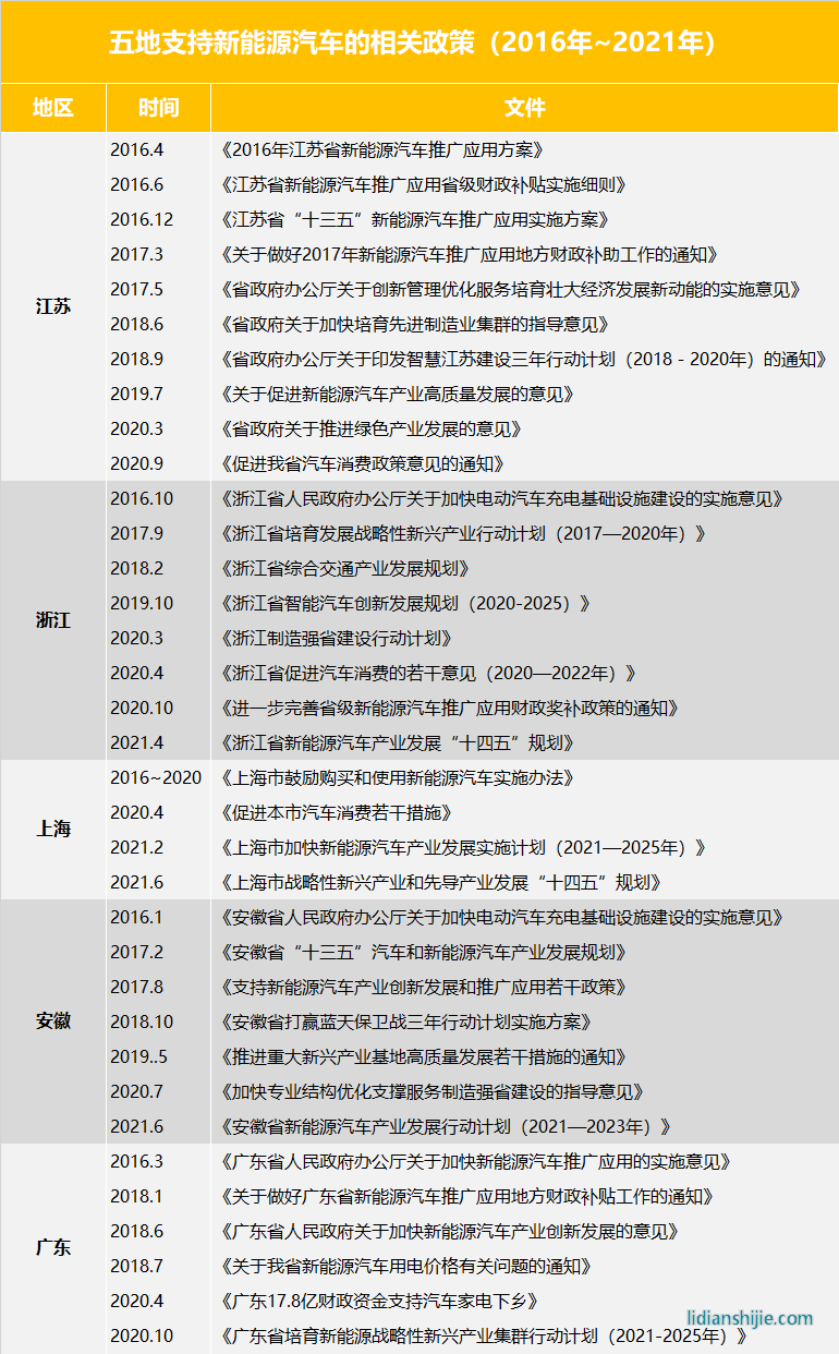 2016年到2021年,5地支持新能源汽车的部分省级文件 | 放大灯团队制图