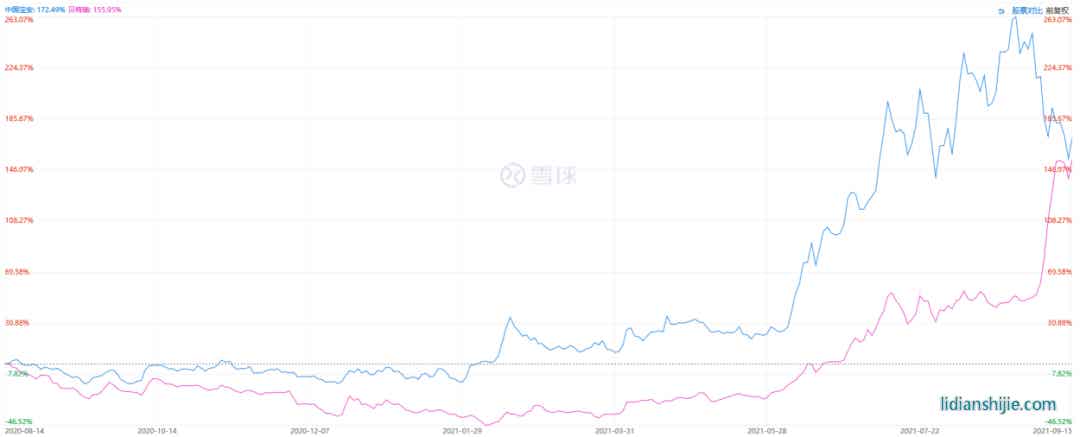 图6:贝特瑞和母公司中国宝安集团的股价走势图,资料来源:雪球