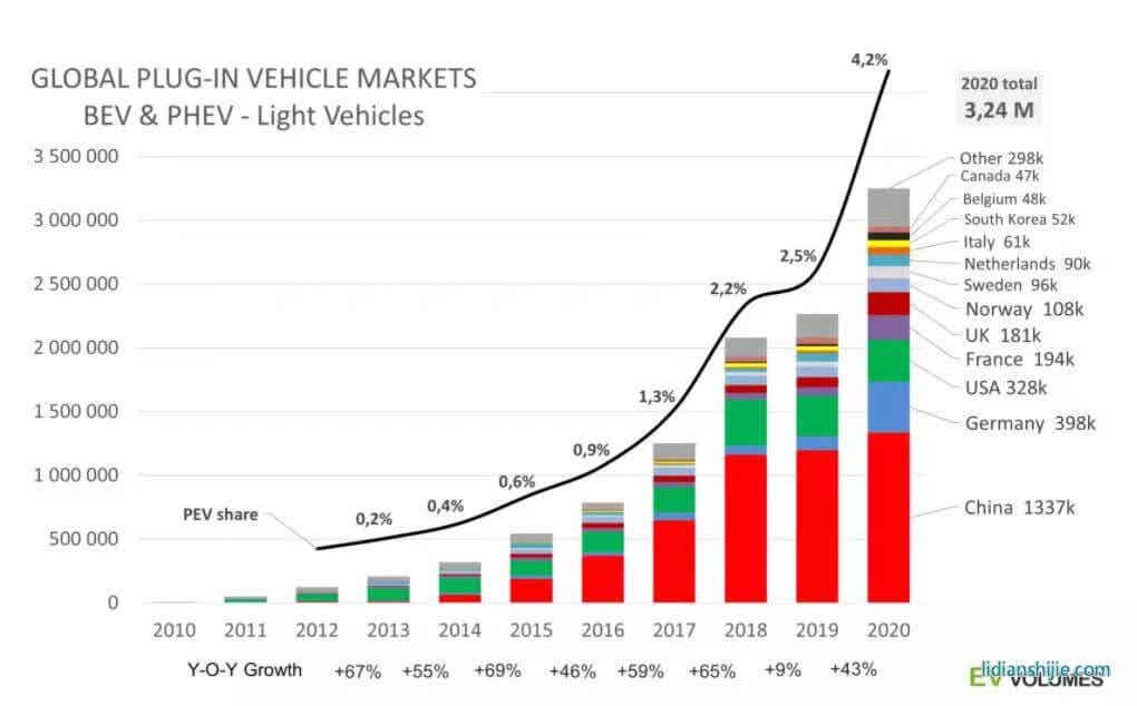 根据EVsales官网的数据显示,中国近几年来一直是全球最大的新能源汽车市场,2020年全球新能源汽车,包括纯电动车(Battery Electric Vehicle,BEV)、插电式混合动力汽车(Plug-in hybrid electric vehicle,简称PHEV)销量为324万辆,而中国为133.7万辆,占全球销量的比重为41.27%。