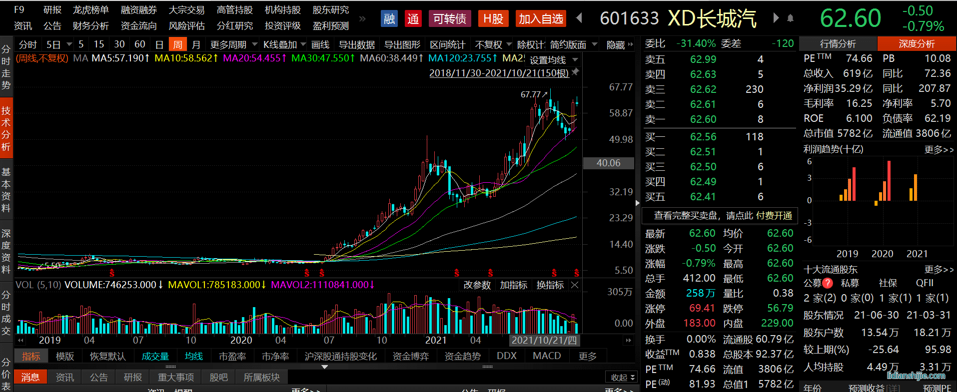 A股两大新能源汽车公司比亚迪和长城汽车股价也自去年六月份开始大涨。长城汽车股价从8元左右上涨到截至20日收盘的63.4元,上涨幅度达到了692.5%,总市值也逼近6000亿。