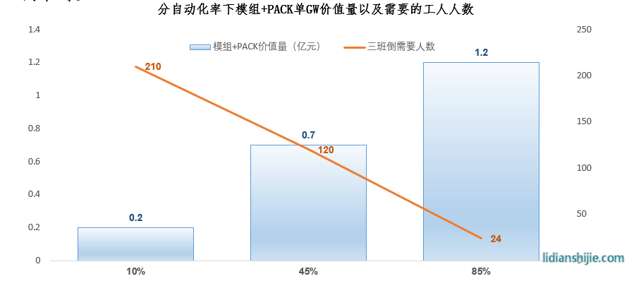 自动化率的提升,带来的模组和PACK价值量的提升非常的显著。在当下全市场自动化率5-10%的情况下,单GW产线价值量只有0.2亿,当自动化率提升到45%时单GW产线为0.7亿元,而当自动化率达到85%时,单GW产线价值量就会提升到1.2亿元,这个价值量是现有全产线价值量1.5亿的80%。
