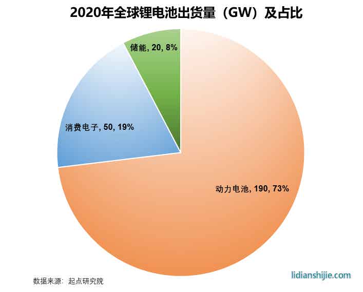目前锂离子电池的下游,主要有三大用途,汽车、手机等消费电子以及储能。根据起点研究院的统计,2020年底,全球锂离子电池的出货量约为260GW,其中用于汽车的动力电池大约为190GW,3C消费电子50GW,储能20GW。