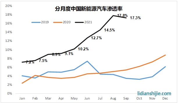 上图是中国新能源汽车的月度渗透率。我们都知道,2021年新能源汽车销售火爆,但不会想到这么火爆。新能源汽车的渗透率从年初的7.2%一步一个台阶的提升,到了8月已经到了17.8%,9月17.3%。