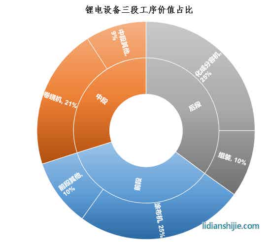 目前市场上每GW锂电设备的投资额大约在1.5亿元左右,一般将锂电设备按照工序分成前中后三段,前中后段设备的价值量占比分别为35%、30%和35%,前段设备的核心是涂布机、中段是卷绕机,后段则是化成分容设备。