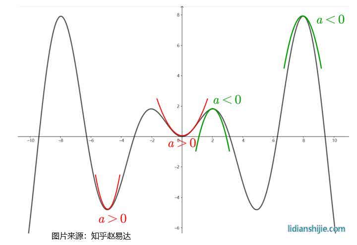 如上图,这就是一条曲线不同阶段所代表的二阶导的值。