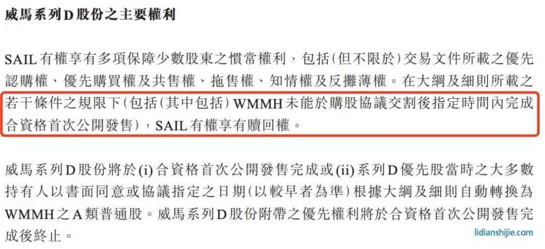值得注意的是,信德也特别在公告提及SAIL权益时表示,“WMMH未能于购股协议交割后指定时间内完成合资格首次公开发售),SAIL有权享有赎回权。”