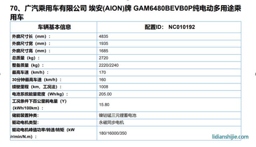 目录信息显示,广汽埃安Aion LX 的永磁同步电动机功率为180千瓦,搭载144.4KWh的电池组,电池系统能量密度为205Wh/kg,百公里耗电量为15.8kwh,NEDC续航为1008km。新车将于11月下旬的广州车展发布上市。