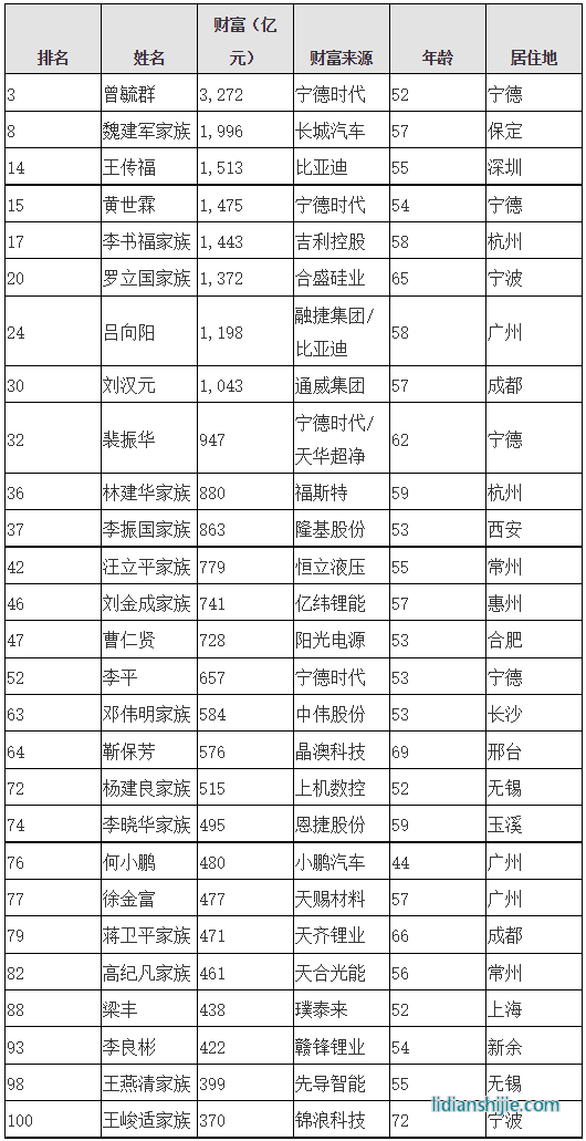 目前中国式全球最大的汽车市场和电动汽车市场,同时也是全球最大的锂电池供应国。宁德时代已经连续多年雄霸全球动力电池出货量第一的企业。除了曾毓群之外,同样参与电动汽车和锂电池的中国百强富豪还有宁德时代的黄世霖、比亚迪的王传福、吉利控股的李书福家族、天齐锂业的蒋卫平家族、小鹏汽车的何小鹏、赣锋锂业的李良彬等。