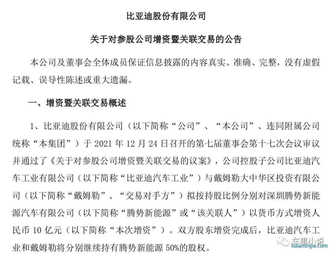 12月14日晚间,比亚迪发布一份《关于对参股公司增资暨关联交易的公告》称,比亚迪和戴姆勒将分别对腾势增资人民币10亿元。双方股东增资完成后,比亚迪和戴姆勒分别继续持有腾势50%股权。