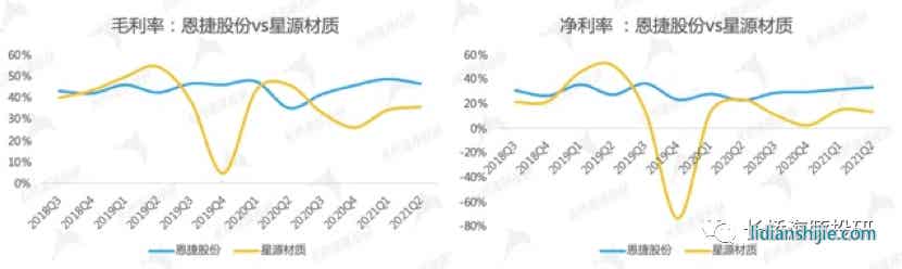 2、行业毛利率最高,35%-50%之间,媲美食品饮料行业平均毛利率,其中恩捷股份以湿法隔膜的生产制造为主,毛利率45%-50%,净利率25%-35%,对比可比公司星源材质毛利率和净利率,恩捷股份盈利行更加稳定,同时在成本和费用端具备明显的优势;