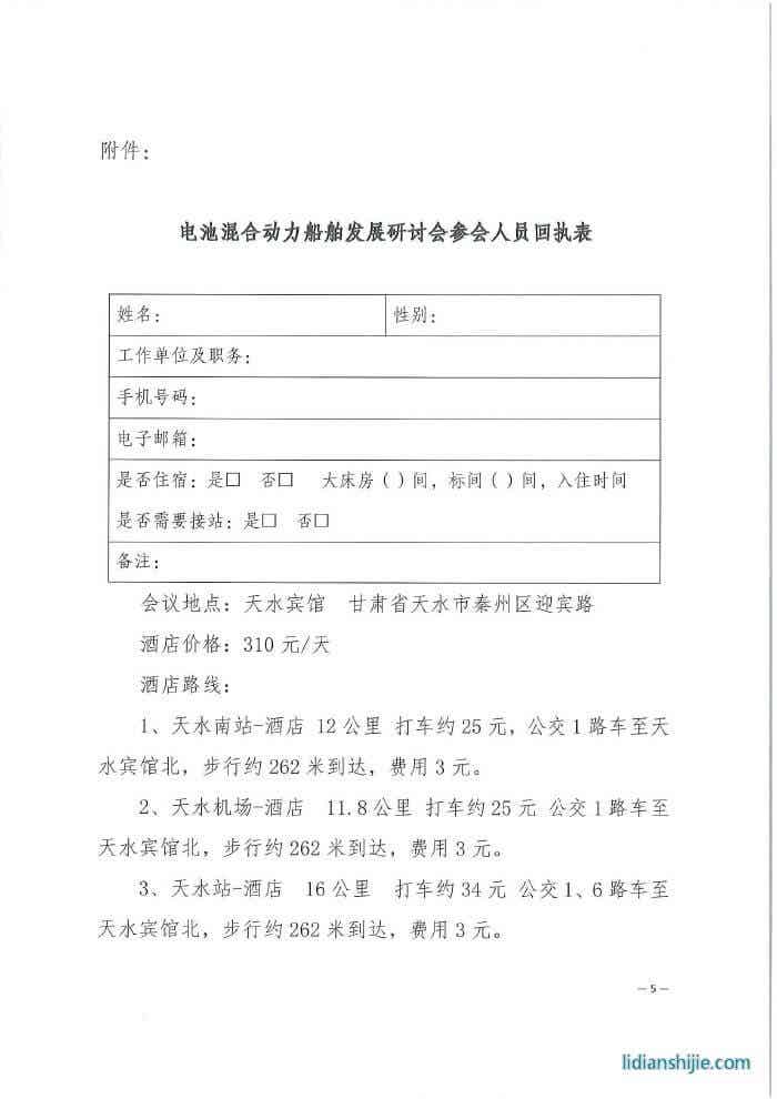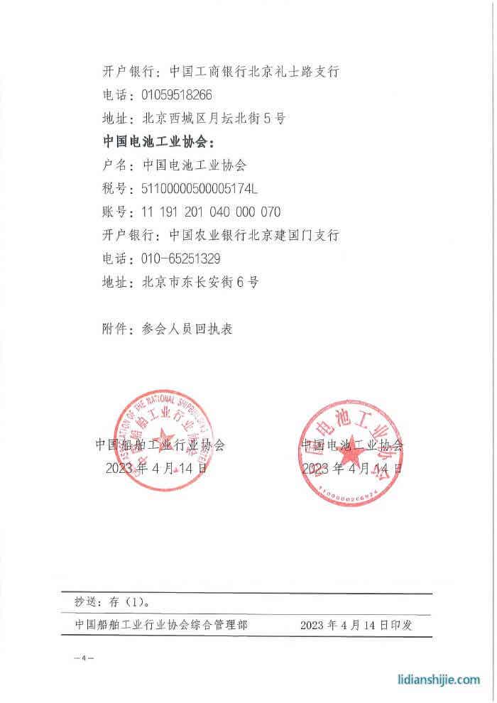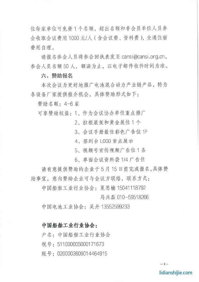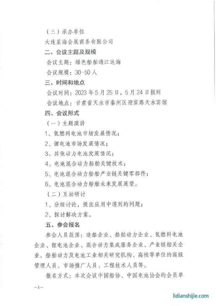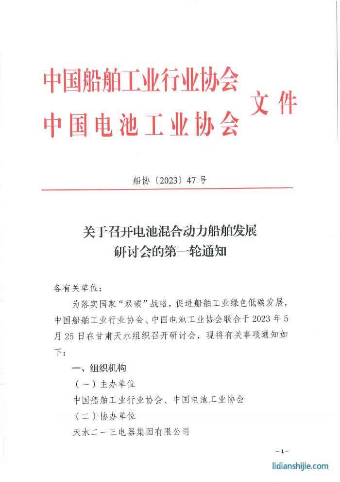 关于召开电池混合动力船舶发展研讨会的第一轮通知 2023-04-17 168620 核心提示:点击下载相关附件:关于召开电池混合动力船舶发展研讨会的第一轮通知.pdf附件:电池混合动力船舶发展研讨会参会人员回执表.docx 点击下载相关附件: 关于召开电池混合动力船舶发展研讨会的第一轮通知.pdf 附件:电池混合动力船舶发展研讨会参会人员回执表.docx 作者:中国电池工业协会 点赞 0举报收藏 0打赏 0评论 0分享 61 更多>同类锂电资讯 • 感觉未来主流会是大电池增程 • 德方纳米荣获2025年度正极材料优质供应商称号 • 奔驰正加速推进电动车固态电池上车进程 • 磷酸铁锂电池渐成市场主力 • 迷之碳酸锂库存 • 锂电产业链周记 | 宁德时代联手五大车企发布10 • 天能发布全新驻车锂电池产品 • 中力再生锂电叉车成汽车零部件企业降本增效“新 • 德意军火巨头向菲律宾出售先进锂电潜艇 • 广东首个“飞轮+锂电”混合新型储能电站落户广