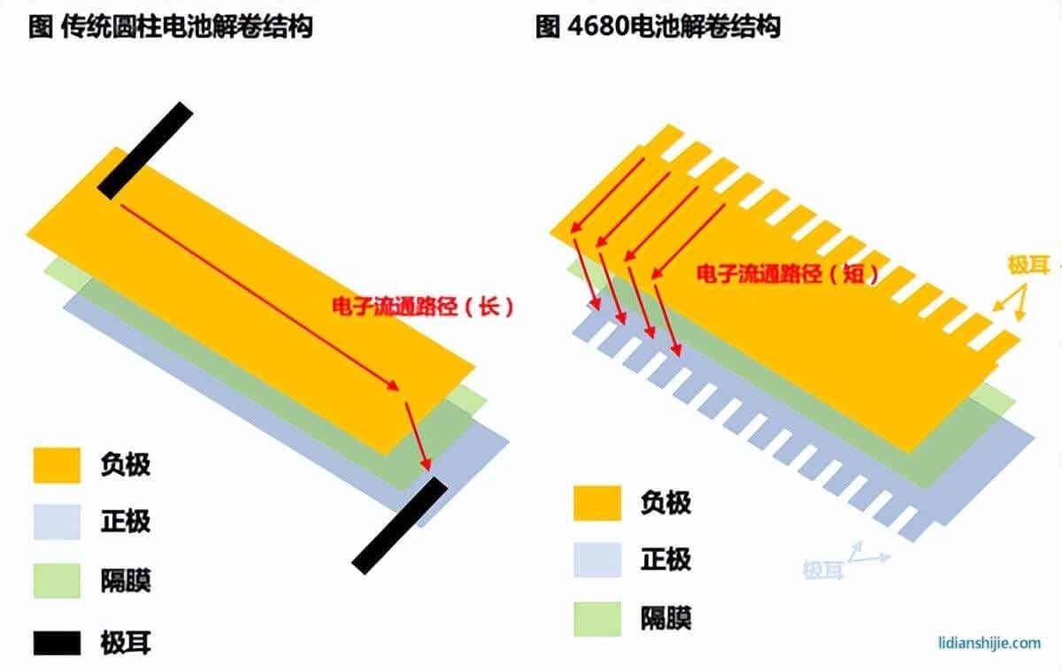 除了尺寸之外,4680电池还有一些技术创新。比如它采用了无极耳或全极耳的设计,就是把正负极薄膜上的边缘都做成锯齿状,然后折成一个平面作为输出端。这样可以大幅减少动力电池的发热和内阻,提高效率和安全性。