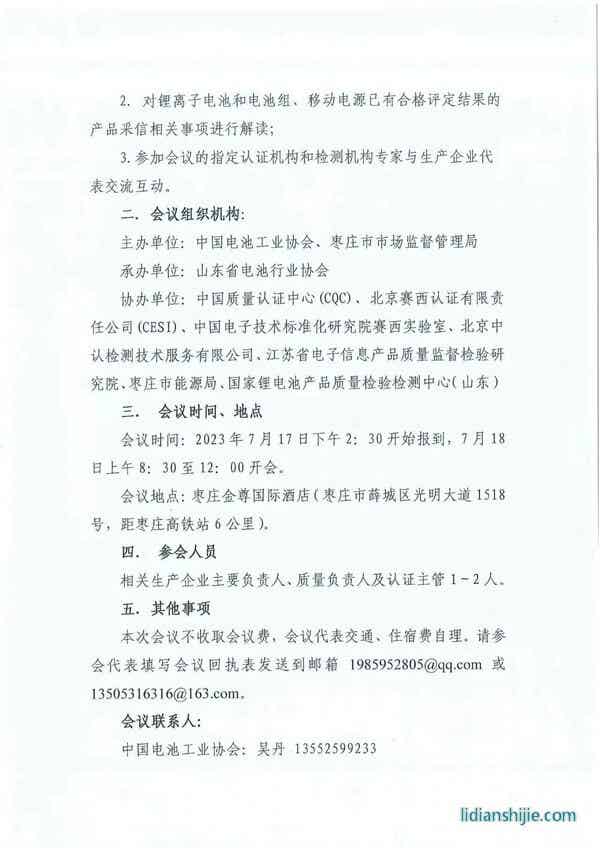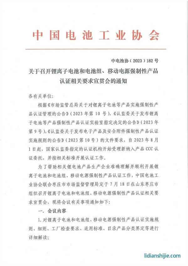 关于召开锂离子电池和电池组、移动电源强制性产品认证相关要求宣贯会的通知 2023-07-05 821780 核心提示:下载附件:参会回执表.docx作者:中国电池工业协会 下载附件: 参会回执表.docx 作者:中国电池工业协会 点赞 0举报收藏 0打赏 0评论 0分享 84 更多>同类锂电资讯 • 感觉未来主流会是大电池增程 • 奔驰正加速推进电动车固态电池上车进程 • 磷酸铁锂电池渐成市场主力 • 迷之碳酸锂库存 • 锂电产业链周记 | 宁德时代联手五大车企发布10 • 天能发布全新驻车锂电池产品 • 中力再生锂电叉车成汽车零部件企业降本增效“新 • 德意军火巨头向菲律宾出售先进锂电潜艇 • 广东首个“飞轮+锂电”混合新型储能电站落户广 • 美国关税对于锂电产业链的影响
