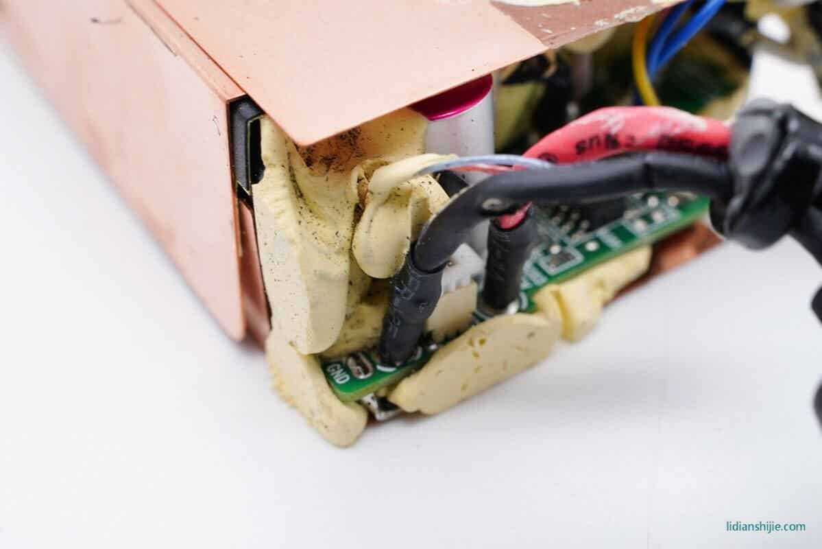 将包裹在PCB板外围的散热铜片拆除,内部使用黄色灌胶填充。