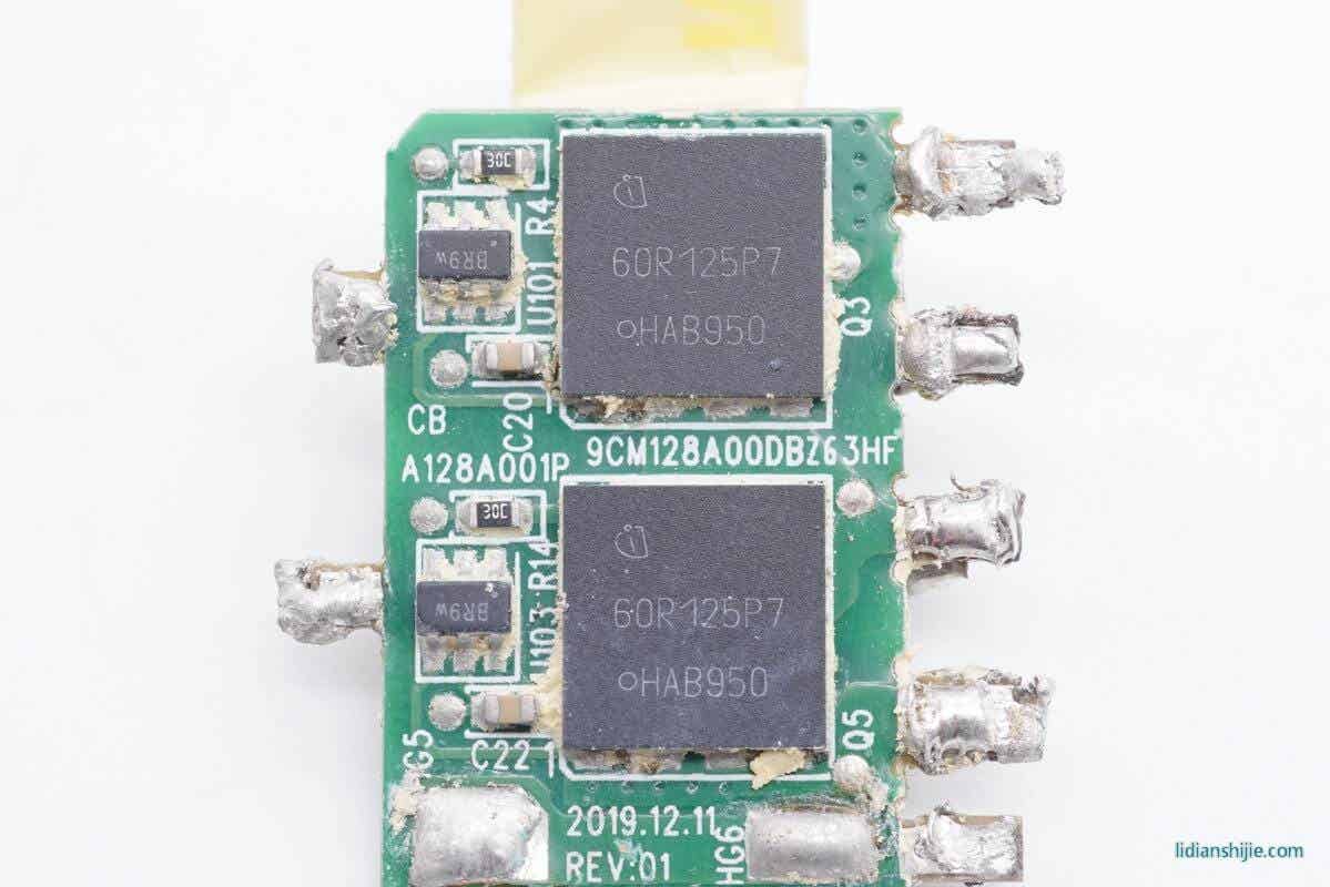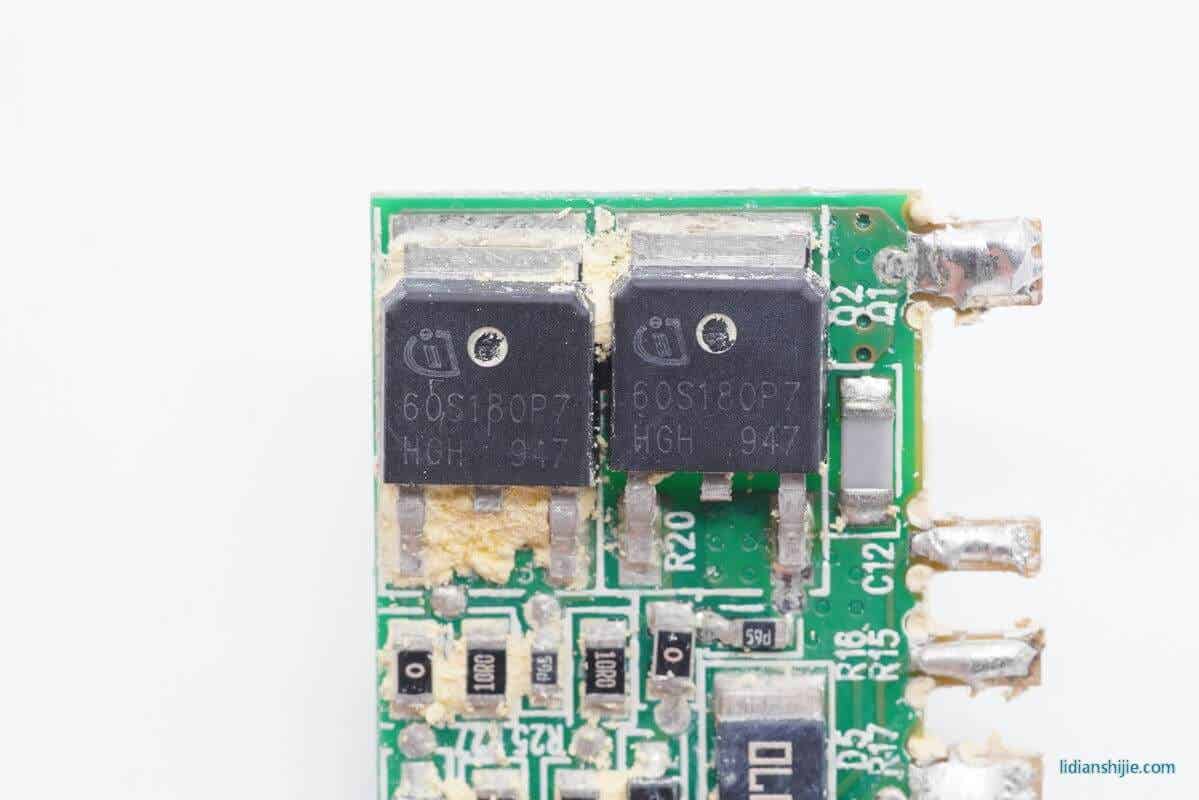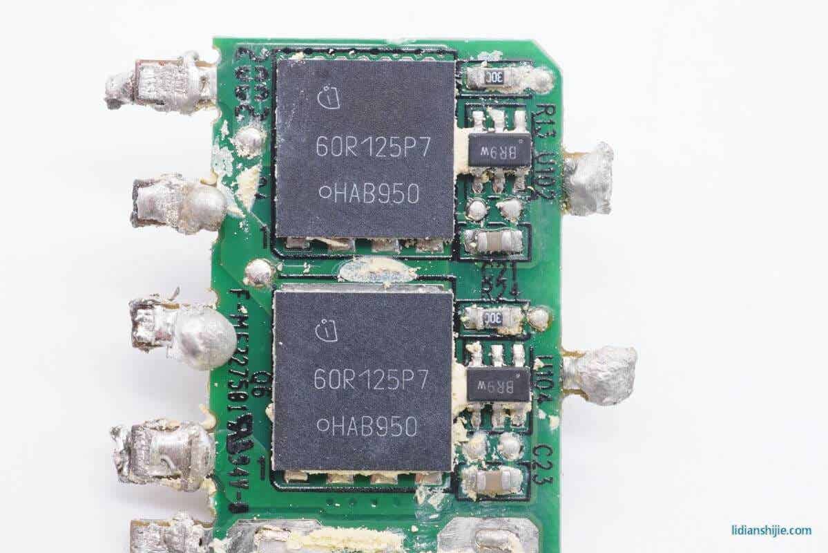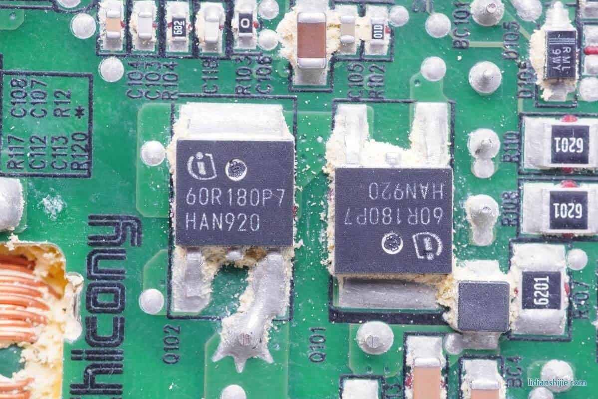 两颗同型号的英飞凌CoolMOS,分别使用一颗六脚芯片驱动,型号IPL60R125P7,耐压600V,导阻125mΩ。