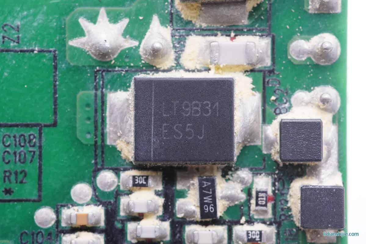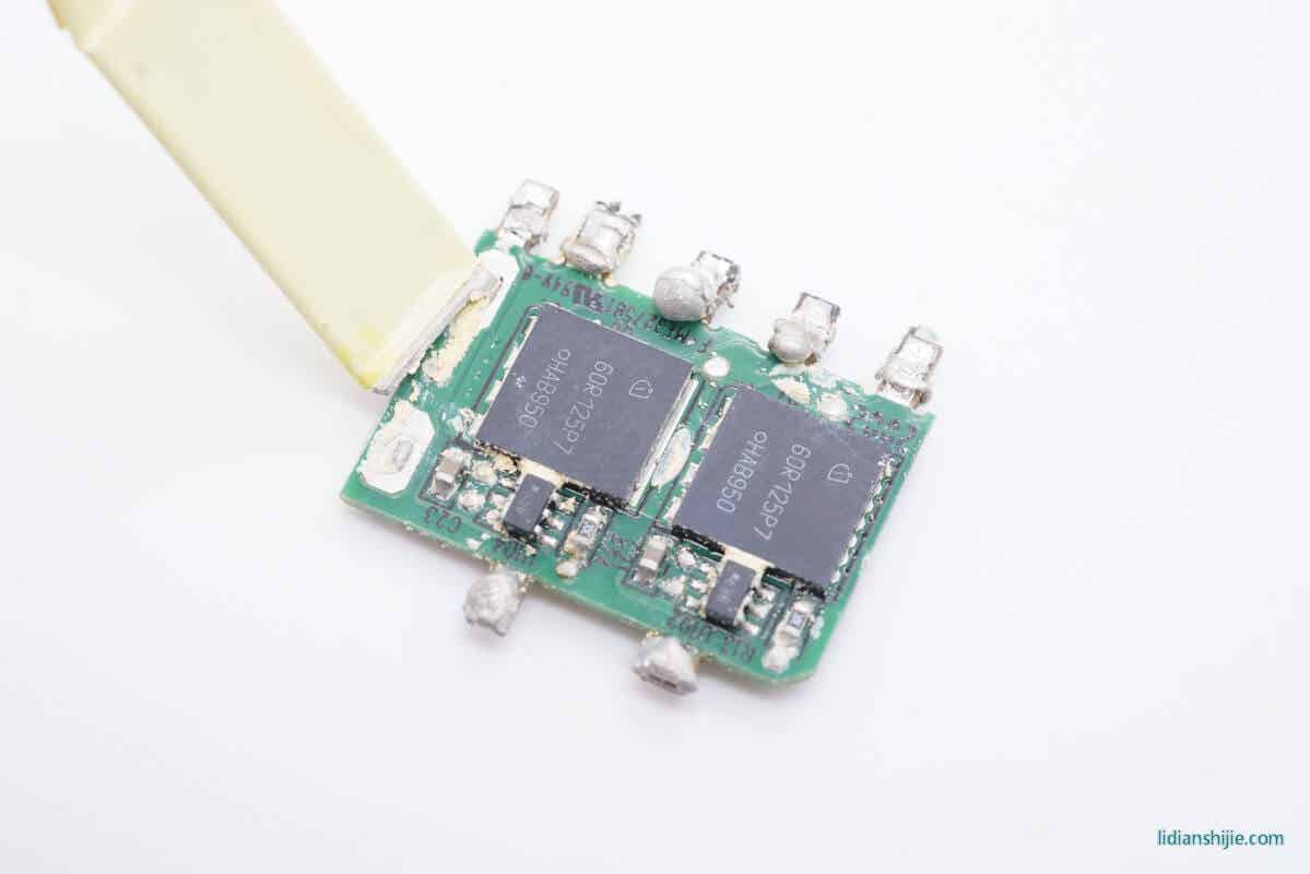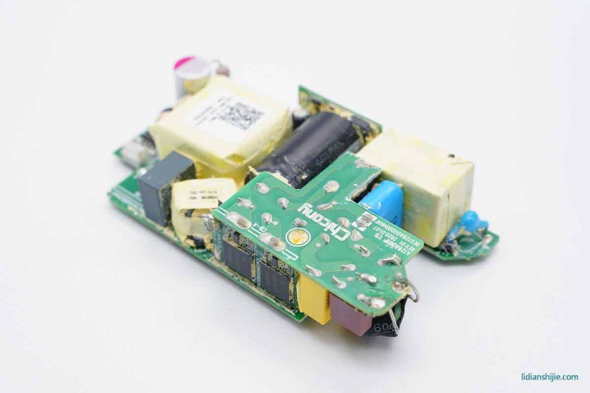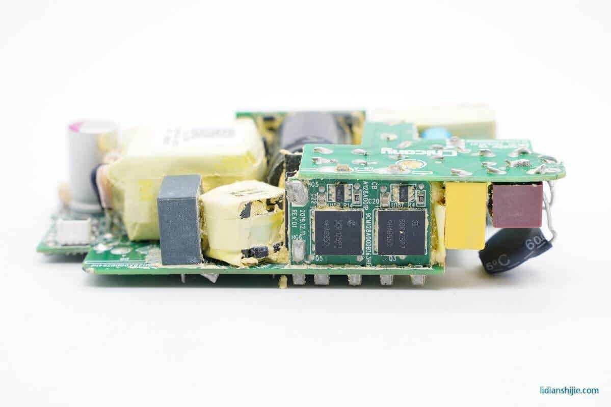 这款充电器采用的是主动整流的设计,散热片下面是两颗英飞凌MOS和两颗控制器。