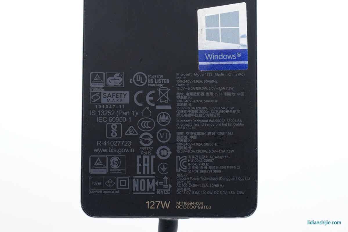 充电器型号1932,输入支持100-240V 1.92A 50/60Hz,输出支持15V 8A,5V 1.5A,制造厂为:群光电能科技股份有限公司。产品已经通过了UL、CE、CCC、GS、PSE、KC等多种认证。