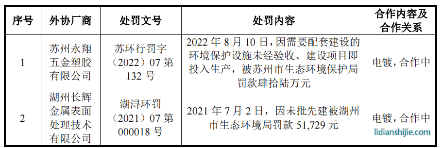 报告期内,委托加工厂商因环境污染、安全生产等违法违规行为受到行政处罚的情况,分别发生在苏州永翔五金塑胶有限公司、湖州长辉金属表面处理技术有限公司。报告期公司的委托加工费用分别为总计1,510.14万元、2,566.74万元和4,413.35万元,占营业成本比例7.91%、3.87%和3.37%。