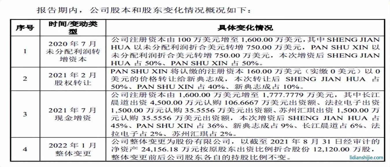 报告期西典新能的员工持股平台新典志成在2020年12月设立时存在少量代持情形,已于2021年11月清理完毕。公司的股权变动多发生在报告期内,2020年7月未分配利润转增资本。PANSHUXIN将认缴的注册资本160.00万美元(实缴0美元)以0美元的价格转让给新典志成;2021年7月现金增资;公司注册资本由1,600.00万美元增至1,777.7779万美元,其中长江晨道出资4,500.00万元认购106.6667万美元出资额、法拉电子出资1,500.00万元认购35.5556万美元出资额、苏州汇琪出资1,500.00万元认购35.5556万美元出资额。