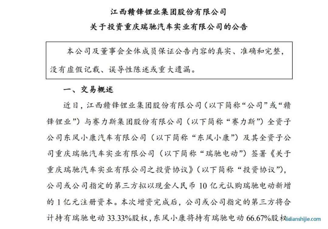 在资本市场中,通过参投股权来换取业务空间的情形并不罕见。同样是以锂为核心的新能源材料巨头,赣锋锂业近日也发布公告,拟以10亿元认购赛力斯孙公司瑞驰电动新增的1亿元注册资本,从而取得其33.33%的股权。