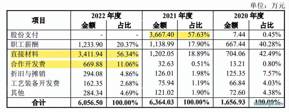 从细分项目来看,珠海赛纬的研发费用水分不少,2021年股份支付已然近6成,报告期直接材料从三位数变成四位数,2022年达3,411.94万元,合作开发费从2020年的12.21万元、2021年的32.63万元,直接升至669.88万元,2021年和2022年两年数据与职工薪酬数额稳步增长并无一致,报告期末公司核心技术人员数量5人,研发人员仅64人,占比17.34%。