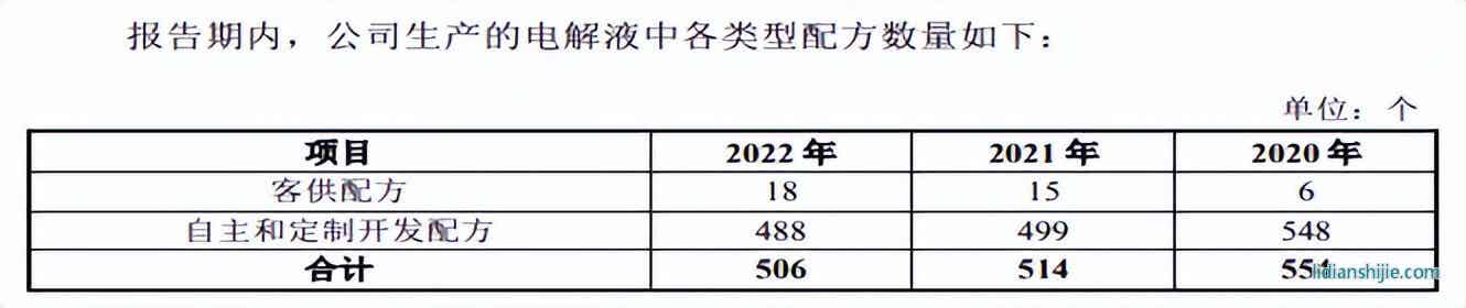 公司从事锂离子电池电解液的研发、生产和销售,电解液属于配方型产品,核心竞争力为添加剂新物质和新配方的开发,主要客户宁德时代、亿纬锂能等企业自身具备电解液配方体系。报告期内,公司凭借自身研发技术优势不断为下游客户自主研发和定制开发配方,生产的电解液型号中,使用公司自主和定制开发配方数量分别为548个、499个和488个,使用客供配方数量为6个、15个和18个。