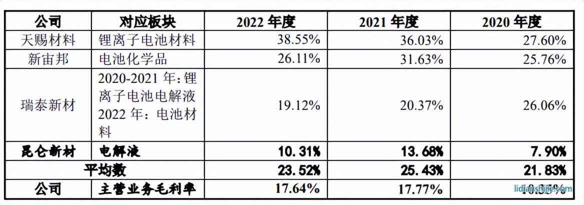 报告期内,公司主营业务毛利率低于同行业可比公司天赐材料、新宙邦及瑞泰新材,但高于昆仑新材的锂离子电池材料相同或类似板块毛利率,除产品类型存在差异有一定影响外,主要是由于原材料自产能力差异导致,部分同行业可比公司规模优势带来的采购成本优势、内外销情况差异以及定价情况等也对个别年度的毛利率差异造成影响。
