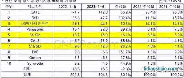 根据SNE research 的数据,2023年上半年,虽然宁德时代依然占据了全球36.8%的市场,甚至全球市占率还提高了1.4个百分点,但比亚迪更加疯狂,市占率上升4.1个百分点来到15.7%,与宁德时代的差距也从去年落后23.8个百分点缩小到21.1个百分点。