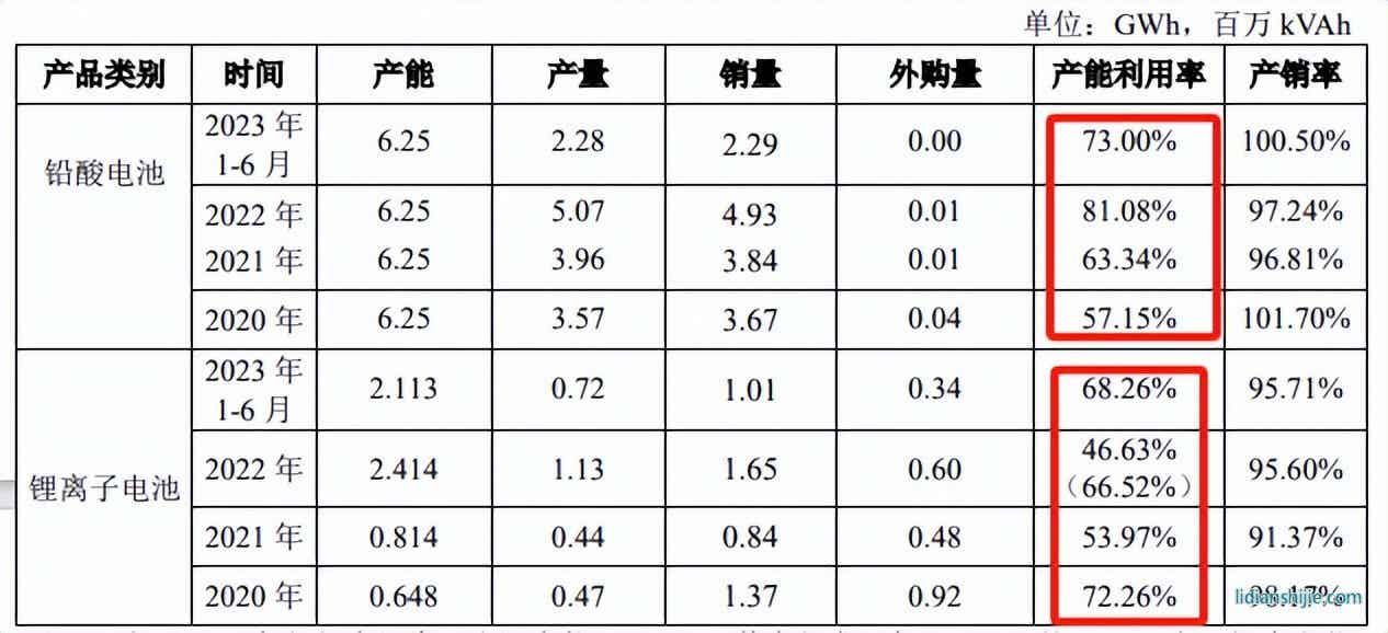 报告期内,公司锂离子电池产能分别为0.65GWh、0.81GWh、2.41GWh和2.11GWh,产能利用率分别为72.26%、53.97%、46.63%和68.26%。公司2021年和2022年锂离子电池产能利用率较低,至2023年1-6月公司锂离子电池产能利用率仍仅为68.26%。
