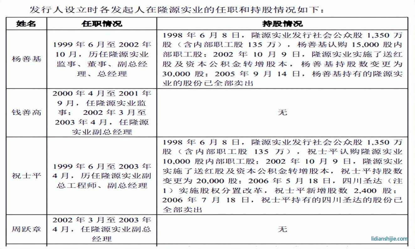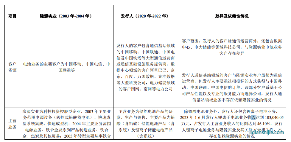 2011年12月8日,自然人杨善基、钱善高、祝士平、周跃章、周平、周伟钢和翟立锋设置了双登集团股份有限公司。其中公司的股东杨善基1999年6月至2002年10月,历任隆源实业监事、董事、副总经理、总经理;钱善高2000年4月至2001年9月,任隆源实业监事;2002年3月至2003年4月,任隆源实业副总经理;祝士平1999年6月至2003年4月,历任隆源实业副总工程师、副总经理;周跃章2002年3月至2003年4月,任隆源实业副总经理。周平、周伟钢虽无就职隆源实业,但持有后者的股权。已退市上市公司隆源实业的电池业务主要应用于通信基站领域,主要为阀控式铅酸电池。