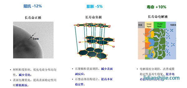 作为蜂巢能源针对电力、工商业领域正向开发的短刀储能电芯,325Ah电芯采用长寿命正负极,大幅优化材料粒度控制及电荷分布均匀性,减少劣化;采用表面包覆优化技术,提高表面稳定性同时降低阻抗;采用长寿命电解液,电解液组分调控,改善成膜稳定性及再生修复,大幅提升电芯循环及日历寿命;应用了石墨颗粒表面调控技术,减少表面副反应,以及石墨晶体结构设计,提高本征稳定性。