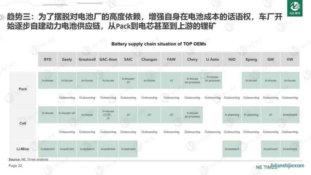 趋势三,为了摆脱对电池厂的高度依赖,增强自身在电池成本的话语权,车厂开始逐步自建动力电池供应链,从Pack到电芯甚至到上游的锂矿。