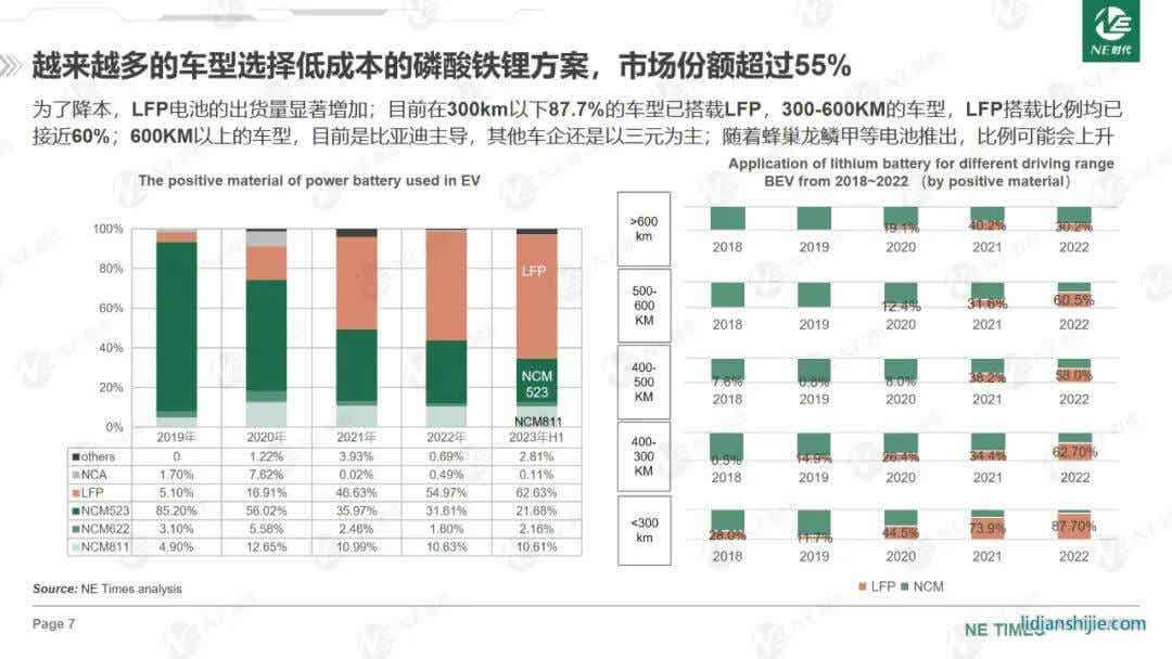 应用层面,中国乘用车市场LFP电池的出货量显著增加。目前在300km以下87.7%的车型已搭载LFP,300-600KM的车型搭载比例接近60%;600KM以上车型,比亚迪大规模切换LFP电池。未来,随着蜂巢龙鳞甲等电池推出,LFP搭载比例可能会上升。