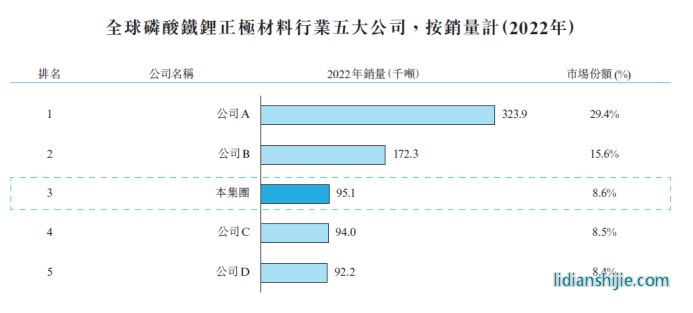 招股书显示,根据弗若斯特沙利文的资料,全球磷酸铁锂正极材料市场高度集中,五大制造商于2022年占据70.5%的市场份额。就2022年的销量而言,龙蟠科技是世界及中国内地第三大磷酸铁锂正极材料制造商,市场份额为8.6%;中国内地第三大车用尿素制造商,市场份额为11.5%;及中国内地第三大冷却液制造商,市场份额为4.6%。