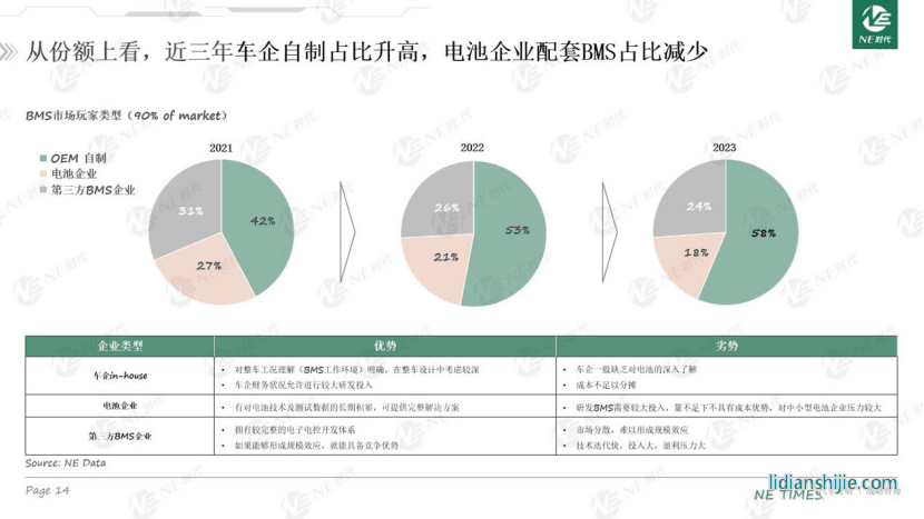 我们根据实际出货份额,同样按照这三类企业做了区分,车企自己出货BMS比例逐渐提升,另外第三方企业份额变小、电池企业份额也在变小,电池企业下降更多,有一部分原因是车企连带着自身布局一块下了,他在过渡期、自己的转型期,为了培育自己的能力,他决定选择更加配合自己的第三方供应商。在这样的背景下,我们会发现流畅的制造过程被车企各种不同的需求、开发思路打散了,有一部分车企开始自己去做,留给第三方供应商的和平会更加分散一些。