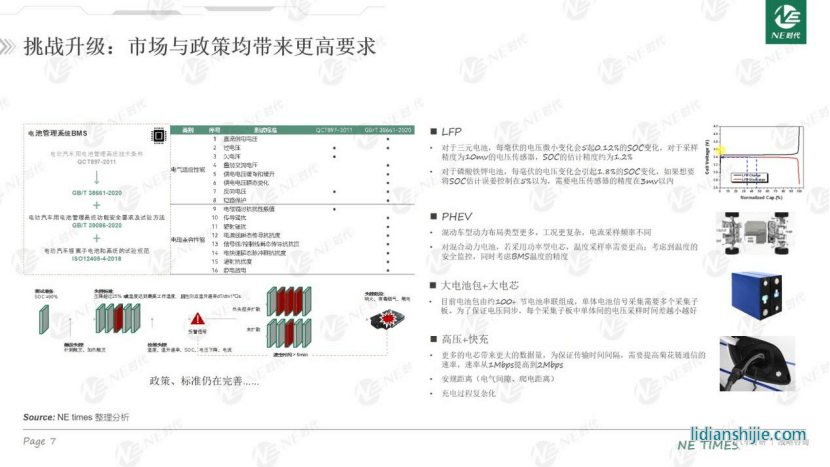 电池决定BMS适用性,对于BMS来讲,早期在标准还不是特别成熟的时候,我们有一系列的测试,经过2020年的标准迭代,增加了电气适应性能、电池间性能,以及之前说到的5分钟不起火不爆炸,都在说明政策标准正在完善,并且提高了BMS体系能力。具体到前面说的材料、汽车类型、大电池包,也是对BMS提出了更高要求。铁锂由于充放电电压平台缘故,同样的测量精度,5毫伏、10毫伏,铁锂的测量误差就是比三元更大,所以?铁锂电池包需要更高的电压传感精度。