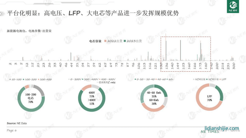 除电芯容量趋势以外,我们发现现在的车辆基本配备100-200个电芯,从90串到120串,这是最主要的电芯分布。这个主要由纯电车主导,纯电车占60%-70%,售价在10万-15万,已经能够很好地适配这个电芯个数;二是电压平台,我粗略分了一下,主要是想看高压,300V到400V的平台能占75%,大于400V的,600V-700V的高压平台还在上升中,目前的数据能达到15%,更高的电压,可以同理去推更高的快充未来是什么样的占比;三是电池容量平台,小容量的A00、A0级车在今年的销量并不高,单车带电量基本上在40-60kWh,这是作为标配,已经非常成熟了。大于60kWh占到了30%,以前我们觉得这个车的电池是最贵的,多带一些电量,一定会价格上升非常多,实际上不光车企在拼价格,也在拼带电量。个人是一名电动车消费者,从我的感受来看,电量给我带来的焦虑真的没有特别大,我感觉大电池包在这个层面上也有着比较好的发展;四是三元和铁锂,这个数据是我们一直以来在强调的,铁锂各方面性能都能很好替代三元,早期铁锂还不是很成熟时以三元为主,现在铁锂已经占据了绝对优势,在下一代新材料体系出来之前,基本上可以认为铁锂真的是行业中一个非常成熟,而且非常全面的解决方案。