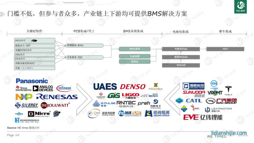 依据BMS产业链,我们梳理了三个大环节,首先是上游组建,中间是PCB代工/系统集成,下游是电池包及整车集成。整体分成三类企业,这些企业并不只是在这样一个环节有自己的产品或者价值。