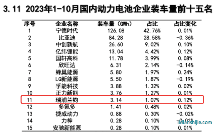 今年1-10月,瑞浦兰钧动力电池装车量为3.14GWh,市占率为1.07%,排名第11位。瑞浦兰钧公布的数据显示,2022年及2023年上半年,在全球锂离子电池制造商中按全球储能电池装机量计,瑞浦兰钧拥有8.8%及5.7%的市场份额,分别排名第三及第四。
