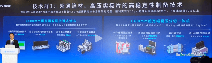 针对在超薄箔材上实现高面密度、高压实极片一致性难控制的问题,在涂布工序中,广汽埃安应用烘箱风平衡仿真技术、全自动涂布闭环调节技术、涂布单元高精度及过辊组件安装精度,可实现4.5μm超薄铜箔高质量稳定生产,在辊压工序中,通过一体化预压延技术、多极耳电磁加热技术、弧形辊设计及液压闭环控制系统,可提升整体极片厚度,实现12μm铝箔超高压室2.65g/c㎡。