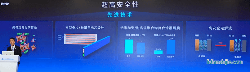 首先,正极采用磷酸铁锂材料体系;其次,方形叠片实现正负极与隔膜的紧密结合,降低长期循环过程中因局部应力不均造成负极析锂和极片断裂的风险,长薄型设计可实现电芯快速散热,降低电芯内外温差,从而降低电池安全风险;此外,新型纳米陶瓷/耐高温聚合物复合涂覆隔膜可实现隔膜在190℃下存储60分钟以上不破碎,130℃下热收缩率优于0.5%,降低极端内短路下电池风险;最后,广汽埃安自行开发高安全电解液,通过引入添加剂,高温情况下在正负极界面自聚合形成隔离层,改善电芯热稳定性,热失控起始温度提升30℃,总产热量降低30%以上。