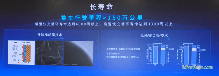 (3)长寿命:多阶梯成膜技术、低耗锂负极技术降低活性锂损失 整车行驶里程将超150万公里