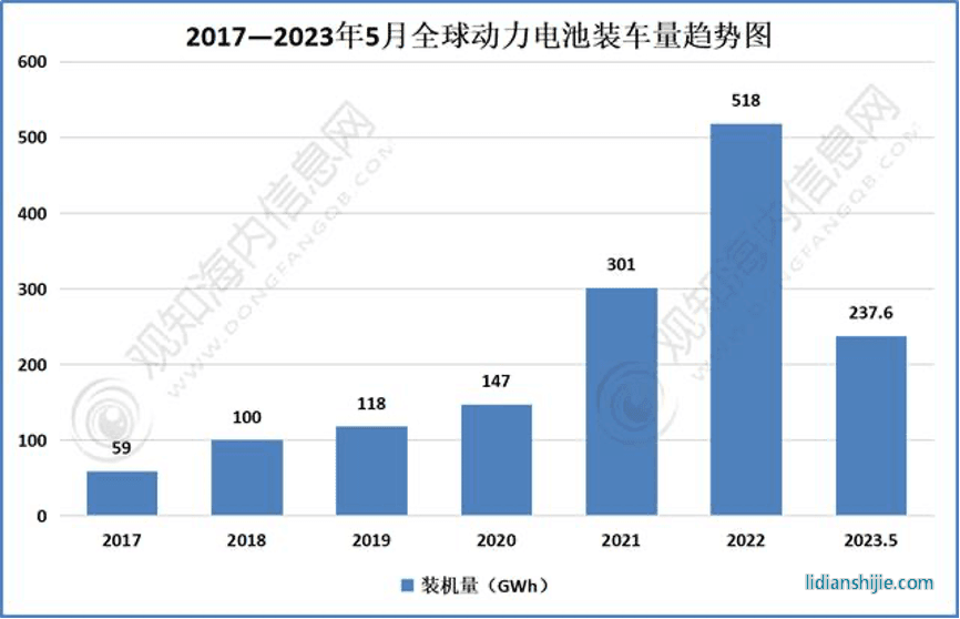 据观知海内信息网统计数据显示,2022年全球动力电池装车量达518GWh。2023年1月到5月,全球动力电池装车量237.6GWh ,同比增长52.3%。预计2023年全球动力电池装车量将突破700GWh。