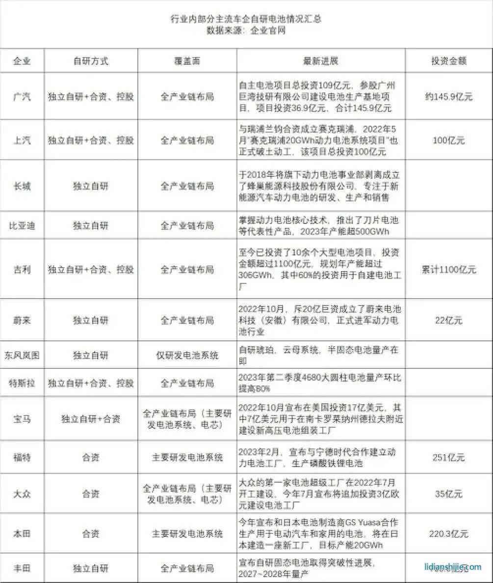 有媒体针对车企自研电池做了一个详细统计,名单上几乎所有国内外整车巨头都已涉足电池产业。比亚迪有弗迪电池、长城有蜂巢能源,特斯拉有4680电池...